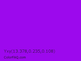 Yxy 13.378,0.235,0.108 Color is a normal purple color and the nearest color is Vivid Violet #9f00ff. Hex code #9c09ed and RGB value is rgb(156,9,237). In RGB color space, this color is composed of 61% red, 4% green, 93% blue, In CMYK color space, this color is composed of 34% cyan, 96% magenta, 0% yellow , 7% black , In HSL color space, this color has a hue angle of 279° , 93% saturation and 48% lightness.