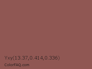 Yxy 13.37,0.414,0.336 Color is a normal red color and the nearest color is Spicy Mix #8b5f4d. Hex code #905753 and RGB value is rgb(144,87,83). In RGB color space, this color is composed of 56% red, 34% green, 33% blue, In CMYK color space, this color is composed of 0% cyan, 40% magenta, 42% yellow , 44% black , In HSL color space, this color has a hue angle of 4° , 27% saturation and 45% lightness.