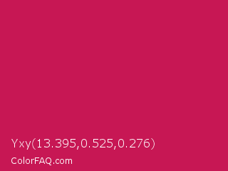 Yxy 13.395,0.525,0.276 Color is a normal rose color and the nearest color is Rose Red #c21e56. Hex code #c71754 and RGB value is rgb(199,23,84). In RGB color space, this color is composed of 78% red, 9% green, 33% blue, In CMYK color space, this color is composed of 0% cyan, 88% magenta, 58% yellow , 22% black , In HSL color space, this color has a hue angle of 339° , 79% saturation and 44% lightness.