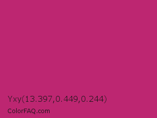 Yxy 13.397,0.449,0.244 Color is a normal rose color and the nearest color is Hibiscus #b6316c. Hex code #bd2671 and RGB value is rgb(189,38,113). In RGB color space, this color is composed of 74% red, 15% green, 44% blue, In CMYK color space, this color is composed of 0% cyan, 80% magenta, 40% yellow , 26% black , In HSL color space, this color has a hue angle of 330° , 67% saturation and 45% lightness.