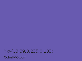 Yxy 13.39,0.235,0.183 Color is a normal indigo color and the nearest color is Blue Violet #6456b7. Hex code #685ab0 and RGB value is rgb(104,90,176). In RGB color space, this color is composed of 41% red, 35% green, 69% blue, In CMYK color space, this color is composed of 41% cyan, 49% magenta, 0% yellow , 31% black , In HSL color space, this color has a hue angle of 250° , 35% saturation and 52% lightness.