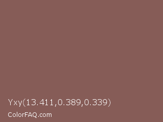 Yxy 13.411,0.389,0.339 Color is a normal red color and the nearest color is Spicy Mix #8b5f4d. Hex code #865c57 and RGB value is rgb(134,92,87). In RGB color space, this color is composed of 53% red, 36% green, 34% blue, In CMYK color space, this color is composed of 0% cyan, 31% magenta, 35% yellow , 47% black , In HSL color space, this color has a hue angle of 6° , 21% saturation and 43% lightness.