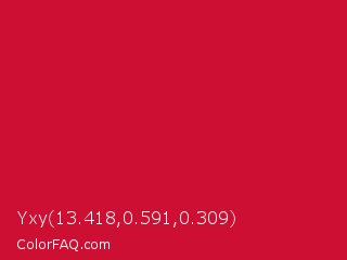 Yxy 13.418,0.591,0.309 Color is a normal red color and the nearest color is Vivid Crimson #cc0033. Hex code #cc0f33 and RGB value is rgb(204,15,51). In RGB color space, this color is composed of 80% red, 6% green, 20% blue, In CMYK color space, this color is composed of 0% cyan, 93% magenta, 75% yellow , 20% black , In HSL color space, this color has a hue angle of 349° , 86% saturation and 43% lightness.