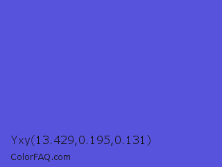 Yxy 13.429,0.195,0.131 Color is a normal indigo color and the nearest color is Majorelle Blue #6050dc. Hex code #5853dc and RGB value is rgb(88,83,220). In RGB color space, this color is composed of 35% red, 33% green, 86% blue, In CMYK color space, this color is composed of 60% cyan, 62% magenta, 0% yellow , 14% black , In HSL color space, this color has a hue angle of 242° , 66% saturation and 59% lightness.