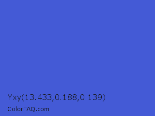 Yxy 13.433,0.188,0.139 Color is a normal blue color and the nearest color is Royal Blue #4169e1. Hex code #445ad6 and RGB value is rgb(68,90,214). In RGB color space, this color is composed of 27% red, 35% green, 84% blue, In CMYK color space, this color is composed of 68% cyan, 58% magenta, 0% yellow , 16% black , In HSL color space, this color has a hue angle of 231° , 64% saturation and 55% lightness.