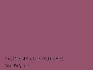Yxy 13.435,0.378,0.283 Color is a normal rose color and the nearest color is Sugar Plum #914e75. Hex code #94526d and RGB value is rgb(148,82,109). In RGB color space, this color is composed of 58% red, 32% green, 43% blue, In CMYK color space, this color is composed of 0% cyan, 45% magenta, 26% yellow , 42% black , In HSL color space, this color has a hue angle of 335° , 29% saturation and 45% lightness.