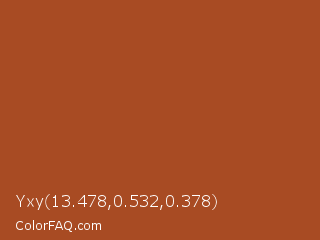 Yxy 13.478,0.532,0.378 Color is a normal orange color and the nearest color is Paarl #a65529. Hex code #a84b23 and RGB value is rgb(168,75,35). In RGB color space, this color is composed of 66% red, 29% green, 14% blue, In CMYK color space, this color is composed of 0% cyan, 55% magenta, 79% yellow , 34% black , In HSL color space, this color has a hue angle of 18° , 66% saturation and 40% lightness.