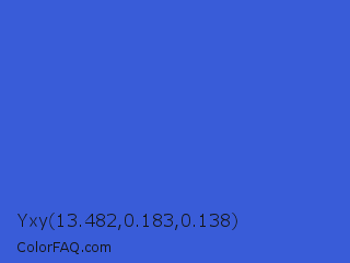 Yxy 13.482,0.183,0.138 Color is a normal blue color and the nearest color is Royal Blue #4169e1. Hex code #395cd8 and RGB value is rgb(57,92,216). In RGB color space, this color is composed of 22% red, 36% green, 85% blue, In CMYK color space, this color is composed of 74% cyan, 57% magenta, 0% yellow , 15% black , In HSL color space, this color has a hue angle of 227° , 67% saturation and 54% lightness.