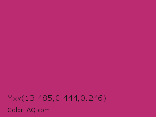 Yxy 13.485,0.444,0.246 Color is a normal rose color and the nearest color is Hibiscus #b6316c. Hex code #bb2b71 and RGB value is rgb(187,43,113). In RGB color space, this color is composed of 73% red, 17% green, 44% blue, In CMYK color space, this color is composed of 0% cyan, 77% magenta, 40% yellow , 27% black , In HSL color space, this color has a hue angle of 331° , 63% saturation and 45% lightness.