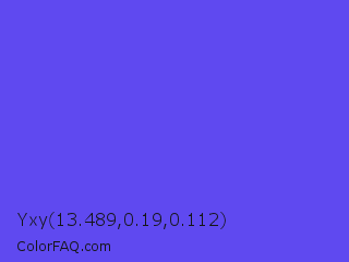 Yxy 13.489,0.19,0.112 Color is a light indigo color and the nearest color is Majorelle Blue #6050dc. Hex code #5f49f0 and RGB value is rgb(95,73,240). In RGB color space, this color is composed of 37% red, 29% green, 94% blue, In CMYK color space, this color is composed of 60% cyan, 70% magenta, 0% yellow , 6% black , In HSL color space, this color has a hue angle of 248° , 85% saturation and 61% lightness.