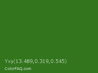 Yxy 13.489,0.319,0.545 Color is a dark green color and the nearest color is Bilbao #327c14. Hex code #32751d and RGB value is rgb(50,117,29). In RGB color space, this color is composed of 20% red, 46% green, 11% blue, In CMYK color space, this color is composed of 57% cyan, 0% magenta, 75% yellow , 54% black , In HSL color space, this color has a hue angle of 106° , 60% saturation and 29% lightness.