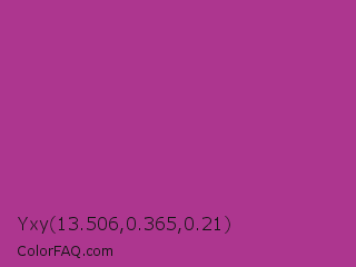Yxy 13.506,0.365,0.21 Color is a normal magenta color and the nearest color is Fandango #b53389. Hex code #ad368f and RGB value is rgb(173,54,143). In RGB color space, this color is composed of 68% red, 21% green, 56% blue, In CMYK color space, this color is composed of 0% cyan, 69% magenta, 17% yellow , 32% black , In HSL color space, this color has a hue angle of 315° , 52% saturation and 45% lightness.