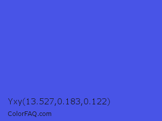 Yxy 13.527,0.183,0.122 Color is a normal blue color and the nearest color is Royal Blue #4169e1. Hex code #4854e7 and RGB value is rgb(72,84,231). In RGB color space, this color is composed of 28% red, 33% green, 91% blue, In CMYK color space, this color is composed of 69% cyan, 64% magenta, 0% yellow , 9% black , In HSL color space, this color has a hue angle of 235° , 77% saturation and 59% lightness.