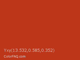 Yxy 13.532,0.585,0.352 Color is a normal red color and the nearest color is Dark Pastel Red #c23b22. Hex code #bd361a and RGB value is rgb(189,54,26). In RGB color space, this color is composed of 74% red, 21% green, 10% blue, In CMYK color space, this color is composed of 0% cyan, 71% magenta, 86% yellow , 26% black , In HSL color space, this color has a hue angle of 10° , 76% saturation and 42% lightness.