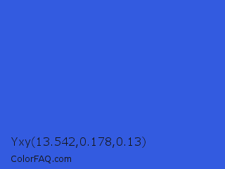 Yxy 13.542,0.178,0.13 Color is a normal blue color and the nearest color is Royal Blue #4169e1. Hex code #335be0 and RGB value is rgb(51,91,224). In RGB color space, this color is composed of 20% red, 36% green, 88% blue, In CMYK color space, this color is composed of 77% cyan, 59% magenta, 0% yellow , 12% black , In HSL color space, this color has a hue angle of 226° , 74% saturation and 54% lightness.