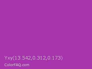 Yxy 13.542,0.312,0.173 Color is a normal magenta color and the nearest color is Byzantine #bd33a4. Hex code #a634ac and RGB value is rgb(166,52,172). In RGB color space, this color is composed of 65% red, 20% green, 67% blue, In CMYK color space, this color is composed of 3% cyan, 70% magenta, 0% yellow , 33% black , In HSL color space, this color has a hue angle of 297° , 54% saturation and 44% lightness.
