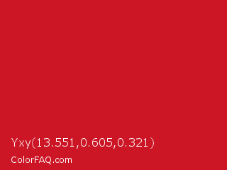 Yxy 13.551,0.605,0.321 Color is a normal red color and the nearest color is Lava #cf1020. Hex code #cc1626 and RGB value is rgb(204,22,38). In RGB color space, this color is composed of 80% red, 9% green, 15% blue, In CMYK color space, this color is composed of 0% cyan, 89% magenta, 81% yellow , 20% black , In HSL color space, this color has a hue angle of 355° , 81% saturation and 44% lightness.
