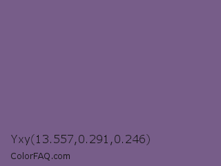 Yxy 13.557,0.291,0.246 Color is a normal purple color and the nearest color is Rum #796989. Hex code #775d89 and RGB value is rgb(119,93,137). In RGB color space, this color is composed of 47% red, 36% green, 54% blue, In CMYK color space, this color is composed of 13% cyan, 32% magenta, 0% yellow , 46% black , In HSL color space, this color has a hue angle of 275° , 19% saturation and 45% lightness.