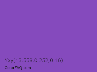 Yxy 13.558,0.252,0.16 Color is a normal purple color and the nearest color is Fuchsia Blue #7a58c1. Hex code #854abd and RGB value is rgb(133,74,189). In RGB color space, this color is composed of 52% red, 29% green, 74% blue, In CMYK color space, this color is composed of 30% cyan, 61% magenta, 0% yellow , 26% black , In HSL color space, this color has a hue angle of 271° , 47% saturation and 52% lightness.