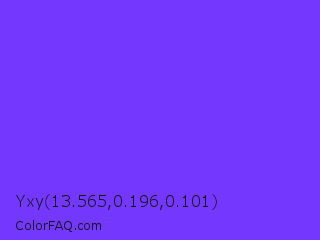 Yxy 13.565,0.196,0.101 Color is a normal indigo color and the nearest color is Blue Violet #8a2be2. Hex code #7437fd and RGB value is rgb(116,55,253). In RGB color space, this color is composed of 45% red, 22% green, 99% blue, In CMYK color space, this color is composed of 54% cyan, 78% magenta, 0% yellow , 1% black , In HSL color space, this color has a hue angle of 258° , 98% saturation and 60% lightness.