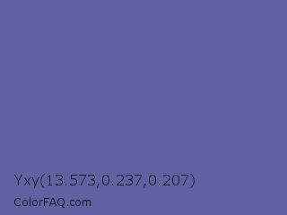 Yxy 13.573,0.237,0.207 Color is a normal blue color and the nearest color is Scampi #675fa6. Hex code #5f61a3 and RGB value is rgb(95,97,163). In RGB color space, this color is composed of 37% red, 38% green, 64% blue, In CMYK color space, this color is composed of 42% cyan, 40% magenta, 0% yellow , 36% black , In HSL color space, this color has a hue angle of 238° , 27% saturation and 51% lightness.
