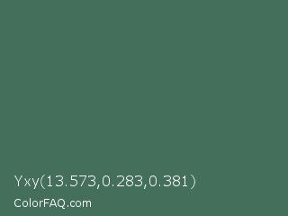 Yxy 13.573,0.283,0.381 Color is a normal green color and the nearest color is Amazon #3b7a57. Hex code #44705b and RGB value is rgb(68,112,91). In RGB color space, this color is composed of 27% red, 44% green, 36% blue, In CMYK color space, this color is composed of 39% cyan, 0% magenta, 19% yellow , 56% black , In HSL color space, this color has a hue angle of 151° , 24% saturation and 35% lightness.