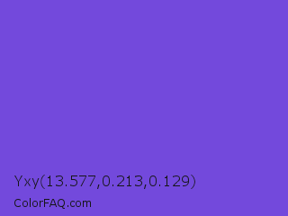 Yxy 13.577,0.213,0.129 Color is a normal indigo color and the nearest color is Majorelle Blue #6050dc. Hex code #7349dc and RGB value is rgb(115,73,220). In RGB color space, this color is composed of 45% red, 29% green, 86% blue, In CMYK color space, this color is composed of 48% cyan, 67% magenta, 0% yellow , 14% black , In HSL color space, this color has a hue angle of 257° , 68% saturation and 57% lightness.