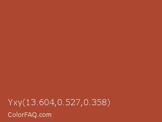 Yxy 13.604,0.527,0.358 Color is a normal red color and the nearest color is Medium Carmine #af4035. Hex code #ad4730 and RGB value is rgb(173,71,48). In RGB color space, this color is composed of 68% red, 28% green, 19% blue, In CMYK color space, this color is composed of 0% cyan, 59% magenta, 72% yellow , 32% black , In HSL color space, this color has a hue angle of 11° , 57% saturation and 43% lightness.