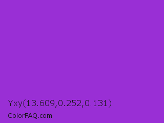 Yxy 13.609,0.252,0.131 Color is a normal purple color and the nearest color is Dark Orchid #9932cc. Hex code #992fd5 and RGB value is rgb(153,47,213). In RGB color space, this color is composed of 60% red, 18% green, 84% blue, In CMYK color space, this color is composed of 28% cyan, 78% magenta, 0% yellow , 16% black , In HSL color space, this color has a hue angle of 278° , 66% saturation and 51% lightness.