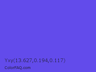 Yxy 13.627,0.194,0.117 Color is a light indigo color and the nearest color is Majorelle Blue #6050dc. Hex code #624beb and RGB value is rgb(98,75,235). In RGB color space, this color is composed of 38% red, 29% green, 92% blue, In CMYK color space, this color is composed of 58% cyan, 68% magenta, 0% yellow , 8% black , In HSL color space, this color has a hue angle of 249° , 80% saturation and 61% lightness.