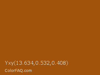 Yxy 13.634,0.532,0.408 Color is a normal orange color and the nearest color is Rich Gold #a85307. Hex code #a1520b and RGB value is rgb(161,82,11). In RGB color space, this color is composed of 63% red, 32% green, 4% blue, In CMYK color space, this color is composed of 0% cyan, 49% magenta, 93% yellow , 37% black , In HSL color space, this color has a hue angle of 28° , 87% saturation and 34% lightness.