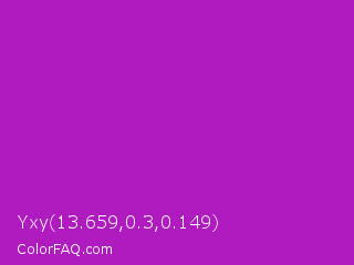 Yxy 13.659,0.3,0.149 Color is a normal magenta color and the nearest color is Heliotrope Magenta #aa00bb. Hex code #af1bbf and RGB value is rgb(175,27,191). In RGB color space, this color is composed of 69% red, 11% green, 75% blue, In CMYK color space, this color is composed of 8% cyan, 86% magenta, 0% yellow , 25% black , In HSL color space, this color has a hue angle of 294° , 75% saturation and 43% lightness.