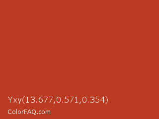 Yxy 13.677,0.571,0.354 Color is a normal red color and the nearest color is Dark Pastel Red #c23b22. Hex code #ba3b21 and RGB value is rgb(186,59,33). In RGB color space, this color is composed of 73% red, 23% green, 13% blue, In CMYK color space, this color is composed of 0% cyan, 68% magenta, 82% yellow , 27% black , In HSL color space, this color has a hue angle of 10° , 70% saturation and 43% lightness.