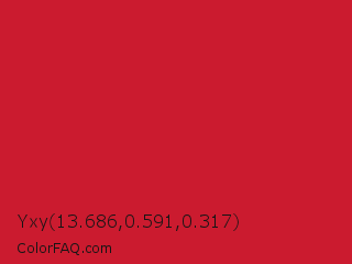 Yxy 13.686,0.591,0.317 Color is a normal red color and the nearest color is Fire Engine Red #ce2029. Hex code #cb1b2f and RGB value is rgb(203,27,47). In RGB color space, this color is composed of 80% red, 11% green, 18% blue, In CMYK color space, this color is composed of 0% cyan, 87% magenta, 77% yellow , 20% black , In HSL color space, this color has a hue angle of 353° , 77% saturation and 45% lightness.