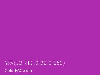 Yxy 13.711,0.32,0.169 Color is a normal magenta color and the nearest color is Byzantine #bd33a4. Hex code #ae2aae and RGB value is rgb(174,42,174). In RGB color space, this color is composed of 68% red, 16% green, 68% blue, In CMYK color space, this color is composed of 0% cyan, 76% magenta, 0% yellow , 32% black , In HSL color space, this color has a hue angle of 300° , 61% saturation and 42% lightness.