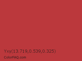 Yxy 13.719,0.539,0.325 Color is a normal red color and the nearest color is Well Read #b43332. Hex code #bb383c and RGB value is rgb(187,56,60). In RGB color space, this color is composed of 73% red, 22% green, 24% blue, In CMYK color space, this color is composed of 0% cyan, 70% magenta, 68% yellow , 27% black , In HSL color space, this color has a hue angle of 358° , 54% saturation and 48% lightness.