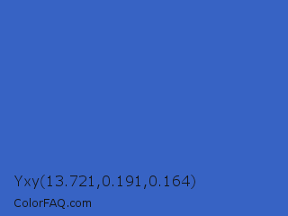 Yxy 13.721,0.191,0.164 Color is a normal blue color and the nearest color is Mariner #286acd. Hex code #3763c4 and RGB value is rgb(55,99,196). In RGB color space, this color is composed of 22% red, 39% green, 77% blue, In CMYK color space, this color is composed of 72% cyan, 49% magenta, 0% yellow , 23% black , In HSL color space, this color has a hue angle of 221° , 56% saturation and 49% lightness.
