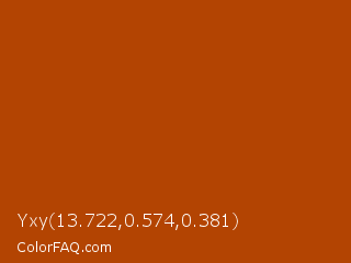 Yxy 13.722,0.574,0.381 Color is a normal orange color and the nearest color is Fire #aa4203. Hex code #b34402 and RGB value is rgb(179,68,2). In RGB color space, this color is composed of 70% red, 27% green, 1% blue, In CMYK color space, this color is composed of 0% cyan, 62% magenta, 99% yellow , 30% black , In HSL color space, this color has a hue angle of 22° , 98% saturation and 35% lightness.