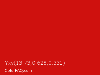 Yxy 13.73,0.628,0.331 Color is a normal red color and the nearest color is Venetian Red #c80815. Hex code #cf110e and RGB value is rgb(207,17,14). In RGB color space, this color is composed of 81% red, 7% green, 5% blue, In CMYK color space, this color is composed of 0% cyan, 92% magenta, 93% yellow , 19% black , In HSL color space, this color has a hue angle of 1° , 87% saturation and 43% lightness.