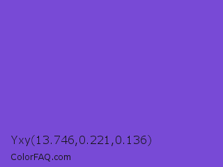 Yxy 13.746,0.221,0.136 Color is a normal indigo color and the nearest color is Slate Blue #6a5acd. Hex code #784ad6 and RGB value is rgb(120,74,214). In RGB color space, this color is composed of 47% red, 29% green, 84% blue, In CMYK color space, this color is composed of 44% cyan, 65% magenta, 0% yellow , 16% black , In HSL color space, this color has a hue angle of 260° , 63% saturation and 56% lightness.