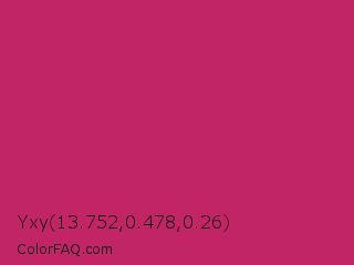 Yxy 13.752,0.478,0.26 Color is a normal rose color and the nearest color is Rose Red #c21e56. Hex code #c22566 and RGB value is rgb(194,37,102). In RGB color space, this color is composed of 76% red, 15% green, 40% blue, In CMYK color space, this color is composed of 0% cyan, 81% magenta, 47% yellow , 24% black , In HSL color space, this color has a hue angle of 335° , 68% saturation and 45% lightness.