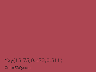 Yxy 13.75,0.473,0.311 Color is a normal red color and the nearest color is English Red #ab4b52. Hex code #ad4552 and RGB value is rgb(173,69,82). In RGB color space, this color is composed of 68% red, 27% green, 32% blue, In CMYK color space, this color is composed of 0% cyan, 60% magenta, 53% yellow , 32% black , In HSL color space, this color has a hue angle of 353° , 43% saturation and 47% lightness.