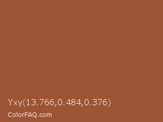 Yxy 13.766,0.484,0.376 Color is a normal orange color and the nearest color is Coconut #965a3e. Hex code #9d5435 and RGB value is rgb(157,84,53). In RGB color space, this color is composed of 62% red, 33% green, 21% blue, In CMYK color space, this color is composed of 0% cyan, 46% magenta, 66% yellow , 38% black , In HSL color space, this color has a hue angle of 18° , 50% saturation and 41% lightness.