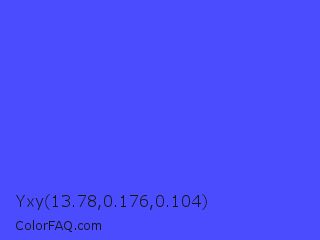 Yxy 13.78,0.176,0.104 Color is a light blue color and the nearest color is Ultramarine Blue #4166f5. Hex code #4a4cfe and RGB value is rgb(74,76,254). In RGB color space, this color is composed of 29% red, 30% green, 100% blue, In CMYK color space, this color is composed of 71% cyan, 70% magenta, 0% yellow , 0% black , In HSL color space, this color has a hue angle of 239° , 99% saturation and 64% lightness.
