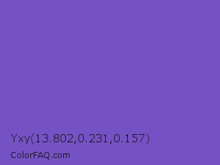 Yxy 13.802,0.231,0.157 Color is a normal indigo color and the nearest color is Fuchsia Blue #7a58c1. Hex code #7552c4 and RGB value is rgb(117,82,196). In RGB color space, this color is composed of 46% red, 32% green, 77% blue, In CMYK color space, this color is composed of 40% cyan, 58% magenta, 0% yellow , 23% black , In HSL color space, this color has a hue angle of 258° , 49% saturation and 55% lightness.