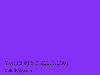 Yxy 13.816,0.211,0.106 Color is a normal violet color and the nearest color is Blue Violet #8a2be2. Hex code #8530f7 and RGB value is rgb(133,48,247). In RGB color space, this color is composed of 52% red, 19% green, 97% blue, In CMYK color space, this color is composed of 46% cyan, 81% magenta, 0% yellow , 3% black , In HSL color space, this color has a hue angle of 266° , 93% saturation and 58% lightness.