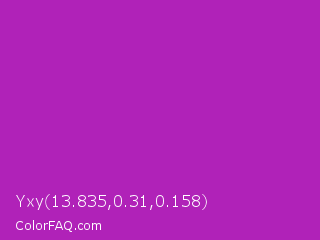 Yxy 13.835,0.31,0.158 Color is a normal magenta color and the nearest color is Byzantine #bd33a4. Hex code #b022b8 and RGB value is rgb(176,34,184). In RGB color space, this color is composed of 69% red, 13% green, 72% blue, In CMYK color space, this color is composed of 4% cyan, 82% magenta, 0% yellow , 28% black , In HSL color space, this color has a hue angle of 297° , 69% saturation and 43% lightness.