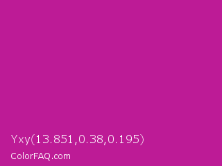Yxy 13.851,0.38,0.195 Color is a normal magenta color and the nearest color is Red Violet #c71585. Hex code #bd1b96 and RGB value is rgb(189,27,150). In RGB color space, this color is composed of 74% red, 11% green, 59% blue, In CMYK color space, this color is composed of 0% cyan, 86% magenta, 21% yellow , 26% black , In HSL color space, this color has a hue angle of 314° , 75% saturation and 42% lightness.