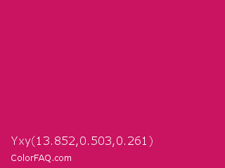 Yxy 13.852,0.503,0.261 Color is a normal rose color and the nearest color is Dogwood Rose #d71868. Hex code #ca1361 and RGB value is rgb(202,19,97). In RGB color space, this color is composed of 79% red, 7% green, 38% blue, In CMYK color space, this color is composed of 0% cyan, 91% magenta, 52% yellow , 21% black , In HSL color space, this color has a hue angle of 334° , 83% saturation and 43% lightness.
