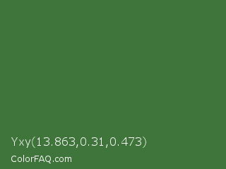 Yxy 13.863,0.31,0.473 Color is a normal green color and the nearest color is Killarney #3a6a47. Hex code #3f743b and RGB value is rgb(63,116,59). In RGB color space, this color is composed of 25% red, 45% green, 23% blue, In CMYK color space, this color is composed of 46% cyan, 0% magenta, 49% yellow , 55% black , In HSL color space, this color has a hue angle of 116° , 33% saturation and 34% lightness.